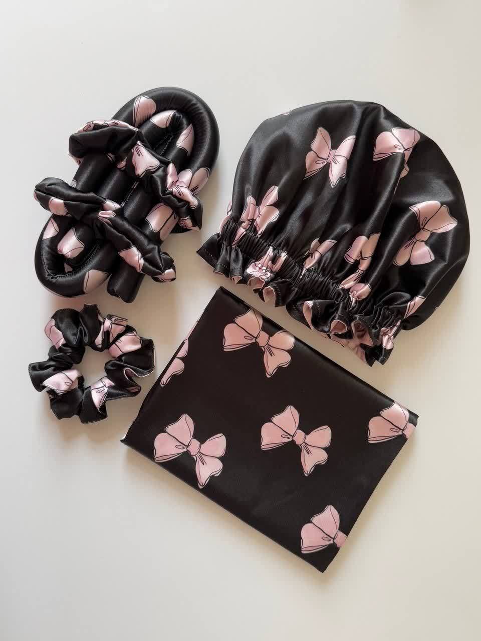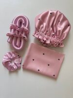 این ست شامل کرلی ساتن، روبالشتی ساتن، اسکرانچی و کلاه دو رو ساتن هست